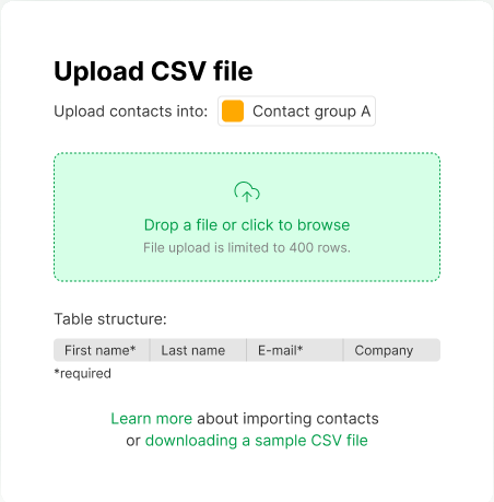Easily upload your entire contact list in just a few clicks. Import contacts from spreadsheets, CRMs, or other tools to get started quickly.